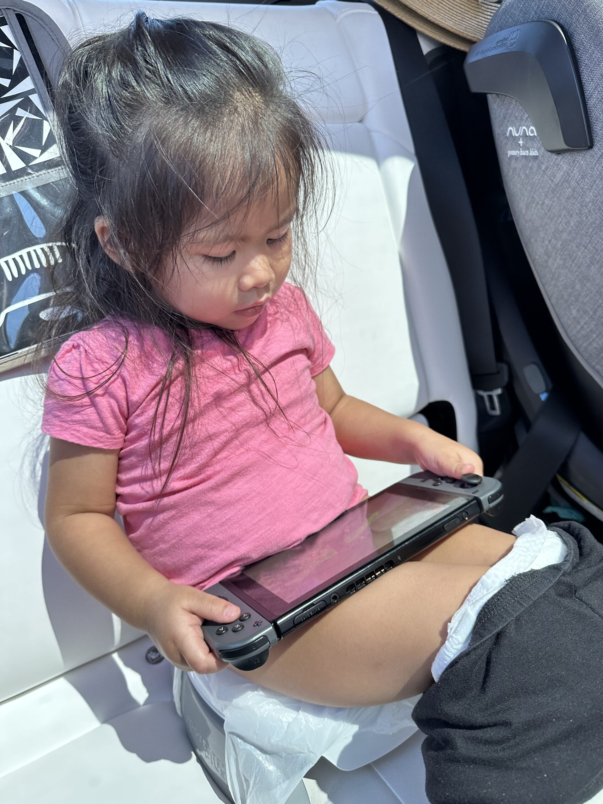 During our trip, we parked outside our destination, presenting the perfect opportunity to try the chair on the go. I easily placed a Potette Plus liner on the chair and set it up on the back seat of our Model Y. After a few moments, Blake used the potty chair for the first time successfully.